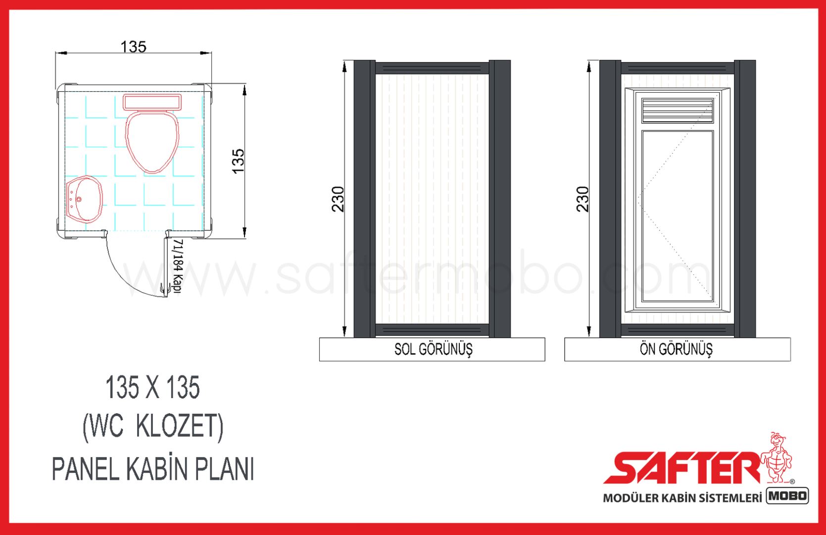 Panel WC kabin 135x135 modelimiz diğer tuvalet kabin ve duş kabin modellerimizde olduğu gibi su ve elektrik tesisatı çekilmiş şekilde hazır olarak kullanıcıya teslim edilmektedir. Sandviç Panel WC kabin 135x135 modelimiz; parklar, sayfiye alanları, plajlar, sahil kenarları, piknik alanları, konser alanları, dizi-film setleri, fabrikalar ve işyerlerinde tercih edilmektedir. EPS Panel 135x135 WC kabin diğer WC kabin modellerimiz gibi şehir mimarisine uygun olarak tasarlanmıştır. Safter Mobo ekonomik ve portatif WC kabin çözümleri sunmaktadır.