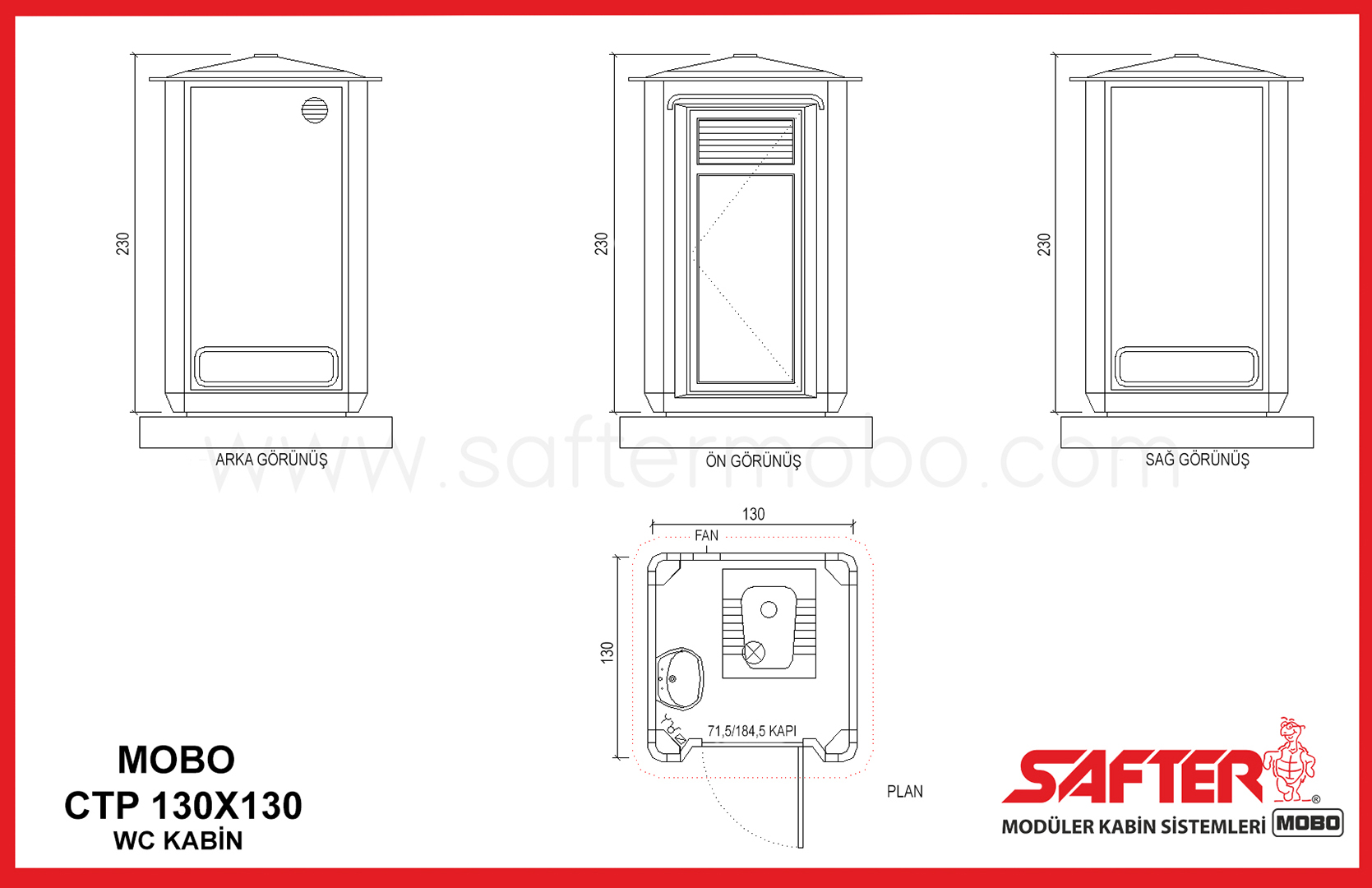 Safter Mobo ekonomik kabin fiyatları, kaliteli hammadde kullanımı, seri üretimi ile tüm kapalı alan ihtiyaçlarınız için ergonomik, opsiyonel, yüksek dayanımlı ve ekonomik çözümler sunmaya devam ediyor. WC kabin 130x130 modelimiz müşterilerimize ekonomik, çevreci, ileri teknoloji, geniş kullanım alanı sunmaktadır. Seyyar tuvalet kabin 130x130 modelimiz hızlı nakliye süreci ve hızlı kurulumuyla saatler içerisinde kullanıma hazır hale gelmektedir. WC polyester kabin 130x130 kesinlikle pas tutmaz, yıkanabilir, uzun yıllar bakım gerektirmez. Modern ve estetik dış görünümü sayesinde çevreyle uyumludur, insan sağlığına herhangi bir yan etkisi yoktur. Safter Mobo Modüler Kabin Sistemleri tüm kabin modellerinde kaliteli ve yüksek dayanımlı olarak üretilmektedir. Sıradan kabin markalarının aksine en kaliteli hammadde kullanımıyla sektörünün en dayanıklı, en sağlam, en uzun ömürlü kabin modelleri Safter Mobo’da. Tüm kabin modellerimiz yerli üretim olarak üretilmektedir. Güvenlik testleri yapılarak fabrikamızdan çıkan kabin modellerimizin elektrik tesisatları ana akım şebekeye bağlantı yapılarak kullanıma başlanabilmektedir. Tuvalet kabini ve duş kabini modellerimizde temiz ve atık su tesisatları ana şebekeye kolayca bağlanarak kullanılabilmektedir. Satış sonrası teknik destek, takip ve müşteri memnuniyeti ile satış sonrası süreçte de yanınızdayız. Tüm kabin modellerimiz için 7/24 web sitemiz, e-posta adresimiz ve telefon ile bilgi alabilirsiniz. Siz de kabin ihtiyaçlarınızda sektörünün lideri Safter Mobo’yu tercih edin. Farkı fark edin.